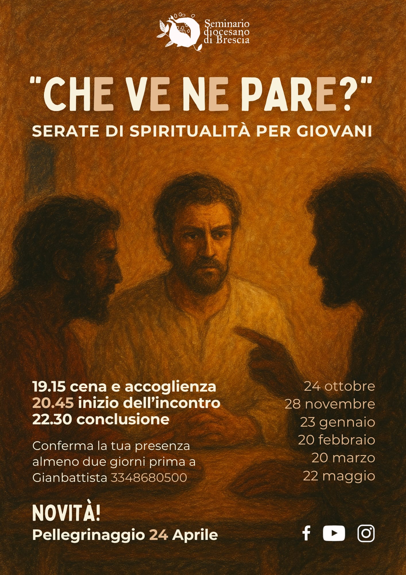 Gli incontri si terranno presso il Seminario di Brescia dalle ore 20,45. Dalle ore 19,30 è possibile condividere la cena insieme con i seminaristi.